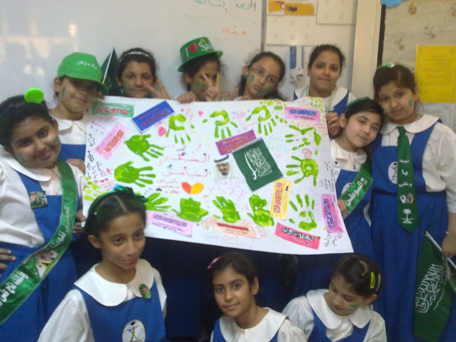 تعريف الطالبات في عرض بوربوينت عن حكام المملكة العربية السعودية والتعرف على مناطق المملكة وعلم المملكة وشعار المملكة وعلام يدل وأيضاً معرفة انجازات الملك عبد الله بن عبد العزيز حفظه الله . والقاء بعض الطالبات القصائد والأناشيد والمواضيع عن اليوم الوطني ومن ثم اعطاء كل فصل ورق مقوى وألوان طباعة ، يقوم كل فصل بطباعة اصابعه ثم تلوين علم المملكة والصاقه على الورق المقوى